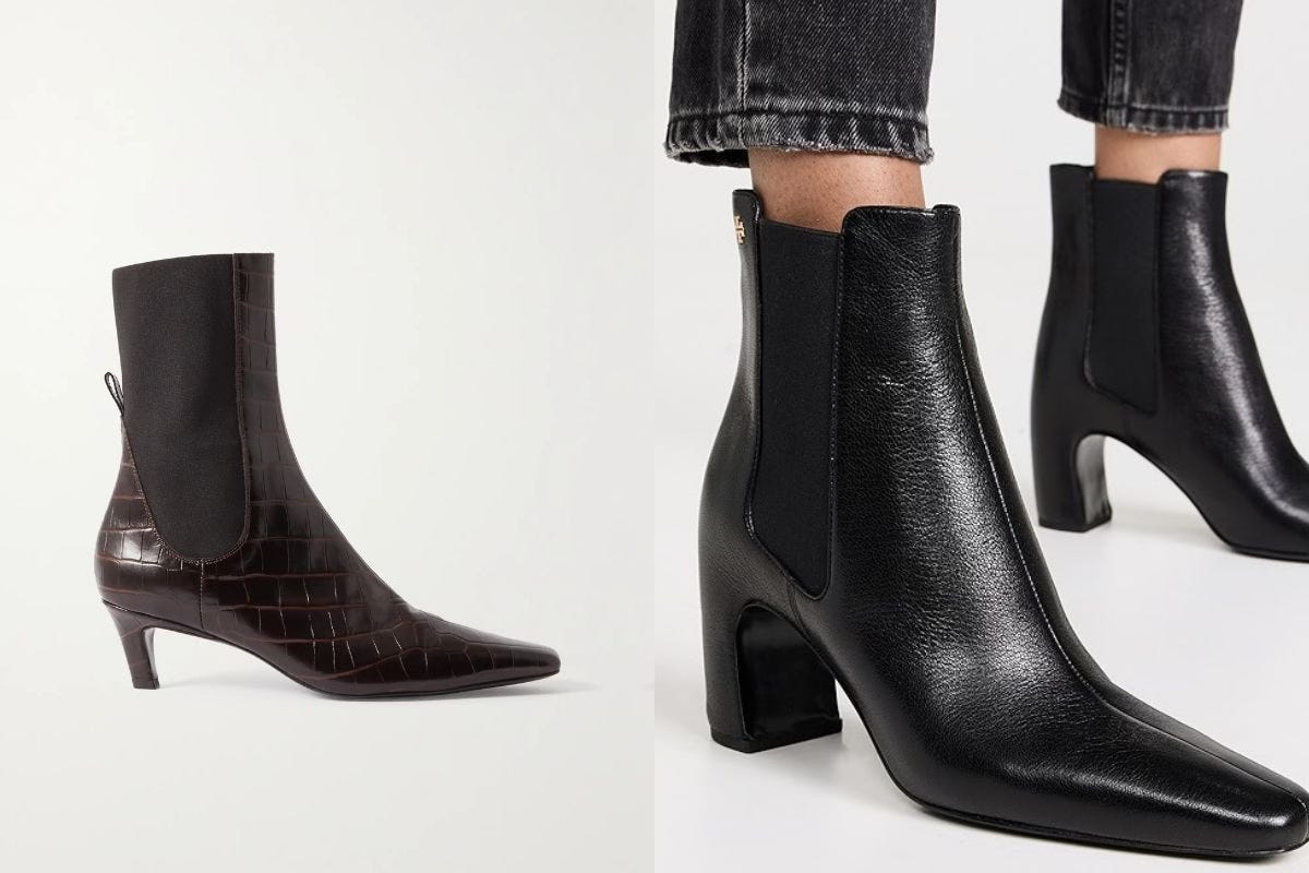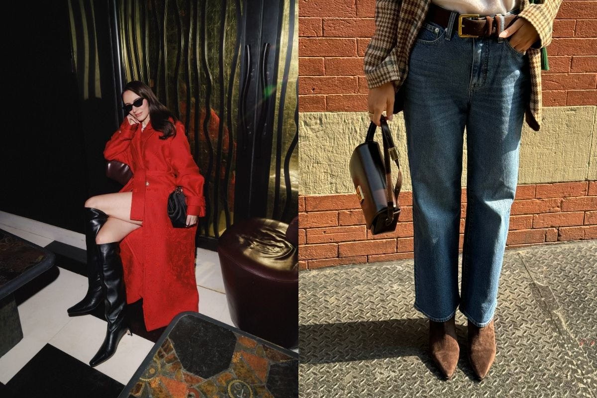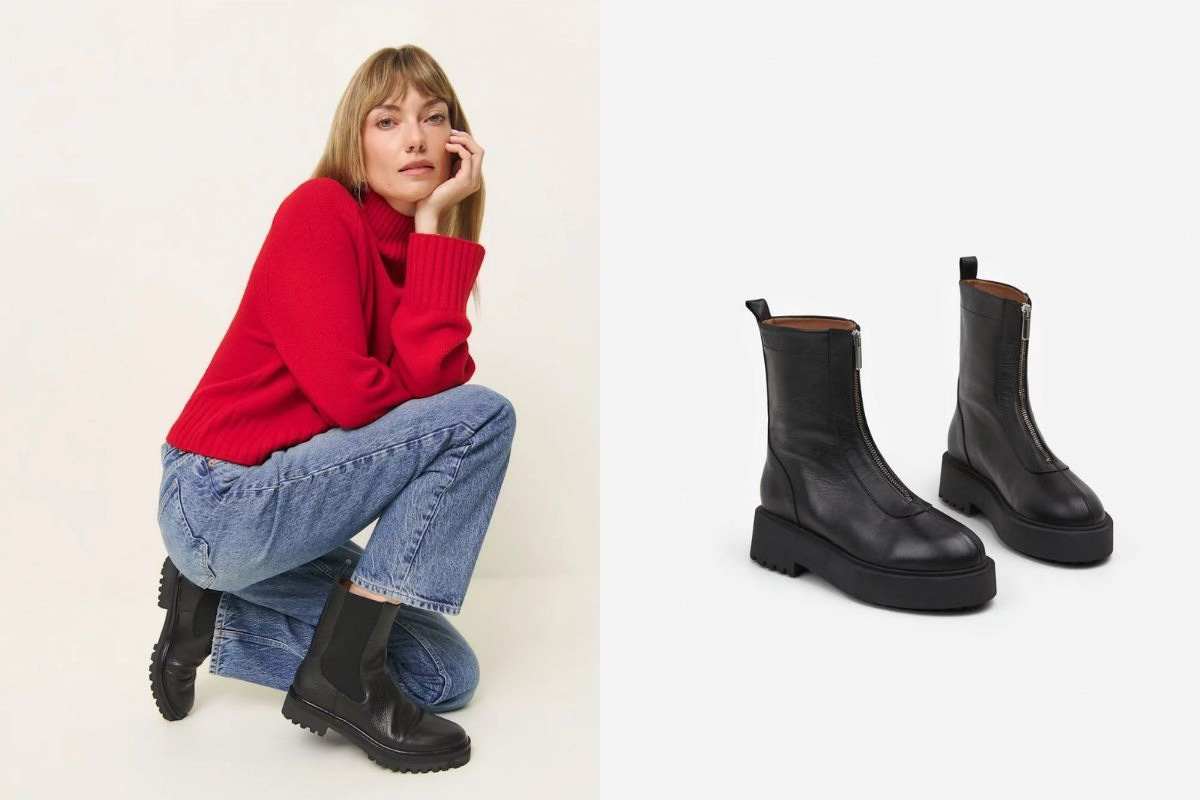 If you’re going to invest in any boot first — let it be a Chelsea boot. It will be your most lived-in shoe this season under jeans and trousers, especially when the weather gets cooler. I invested in the Loro Piana Kilda boot last season — I love the sleek look of them. When picking a Chelsea boot, I recommend paying attention to the sole because that’s a big personality point. Lug soles will have a chunky wide bottom with treads like the Reformation boots below, while rubber soles will appear sleeker. If you’re going to be in snow, highlight recommend getting ones with treads!